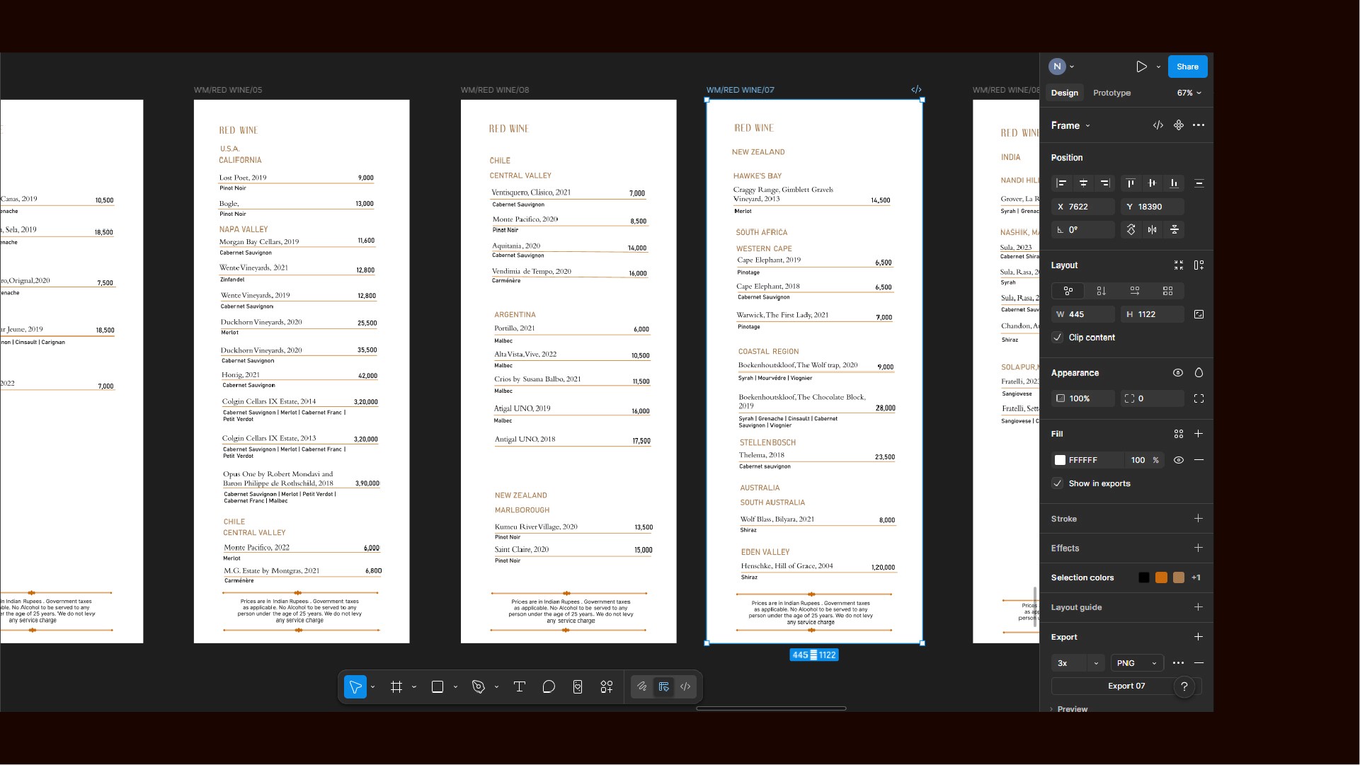 Templates were built in Figma with locked layout, typography, and spacing. Only the text fields are editable. This means a sommelier or F&B manager can update content directly, with no designer in the loop and no risk of someone accidentally shifting a column or changing a typeface.