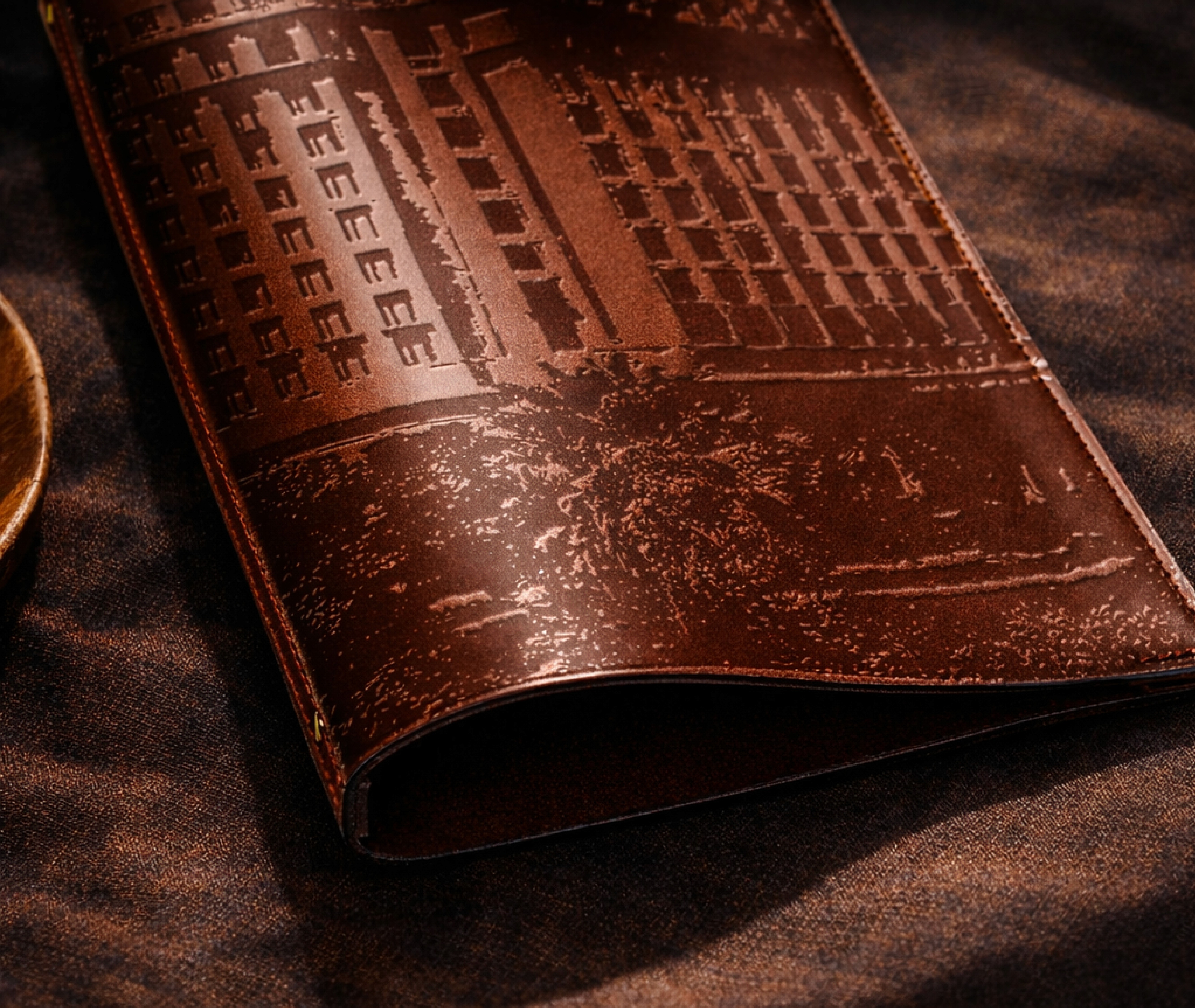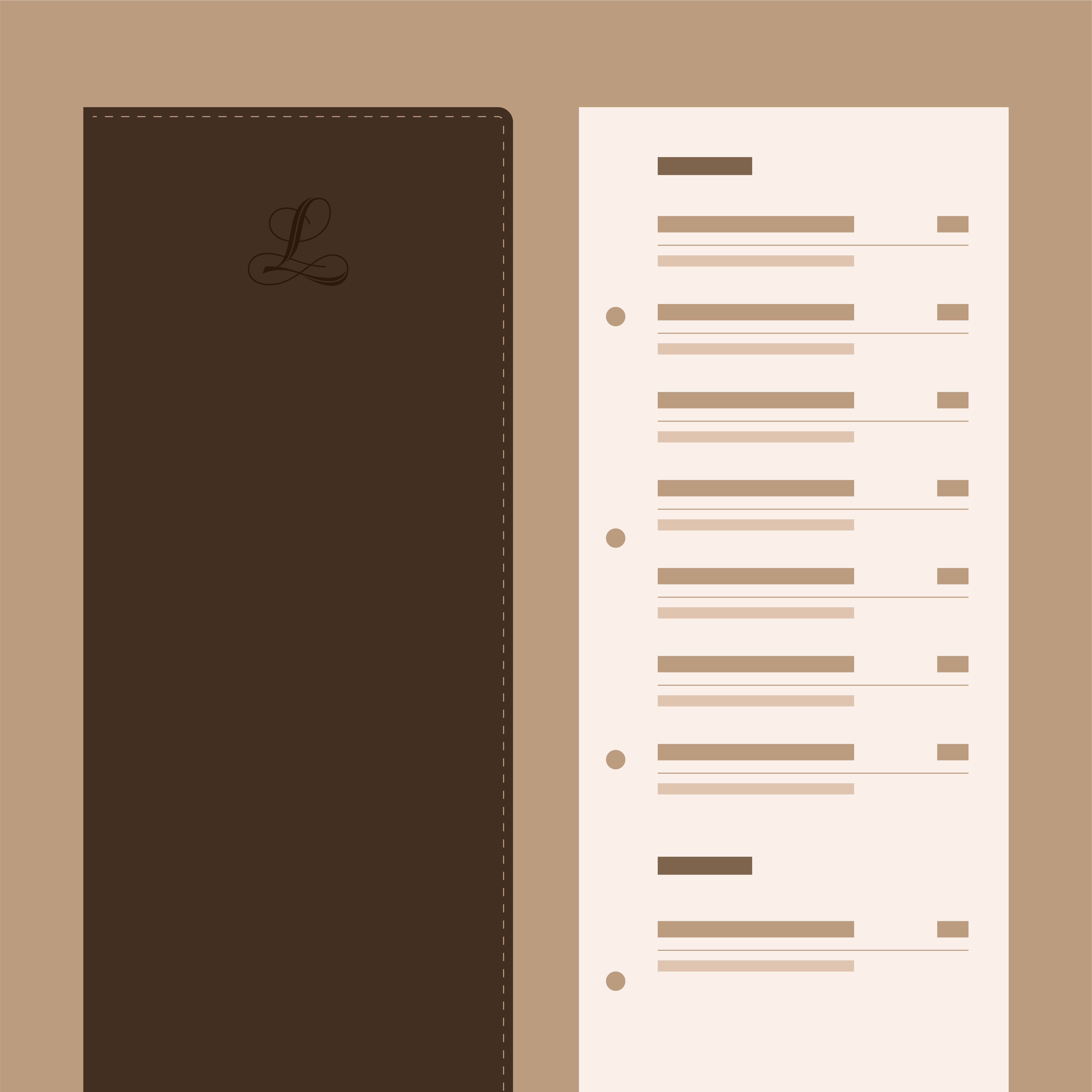 A Stable Outer Cover. A leather-like folder with embossed branding holds everything together. The cover never changes. It carries the identity of the property while the pages inside move freely. The tension between the permanent exterior and the dynamic interior is exactly the point.