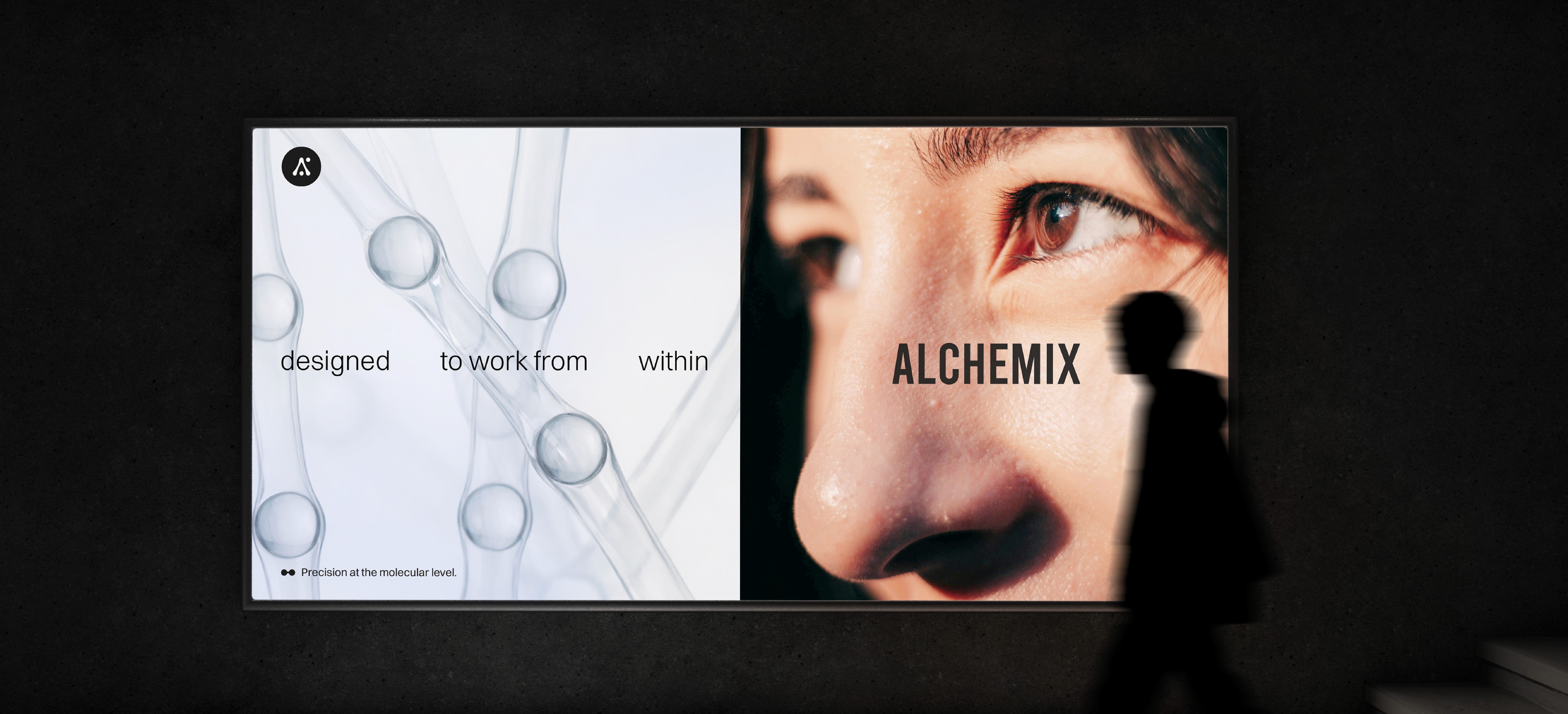 The mark is built the way the product is built. Molecular dot forms come together to construct the letter A, each node a bond, each bond a decision. These molecular bonds symbolise the fusion of science and innovation, reflecting how individual elements unite to create something more powerful than any one of them alone. Precise, interconnected, and clean. A logo that communicates the brand's modern scientific identity without saying a word, and rewards the closer look with more meaning, not less.