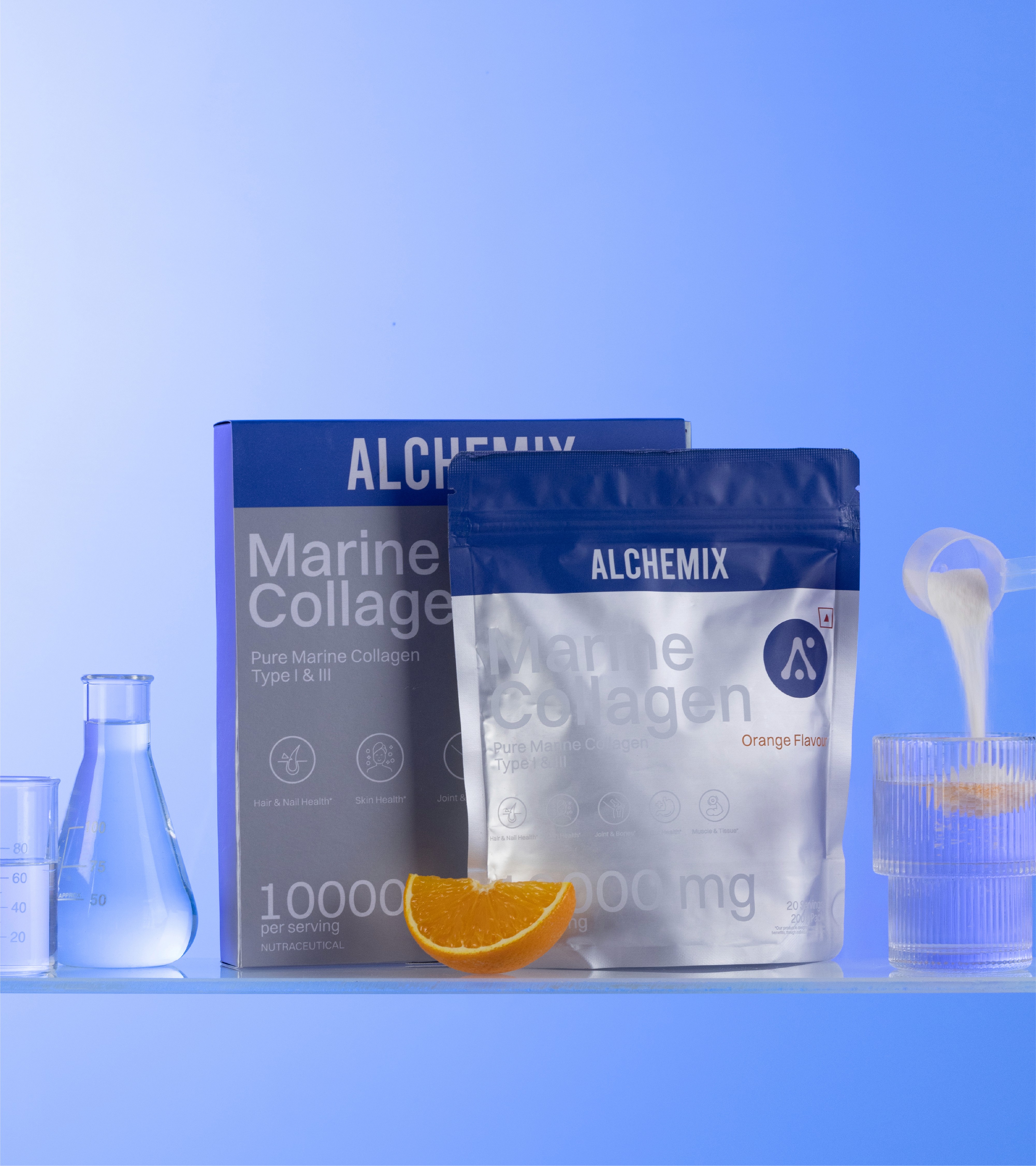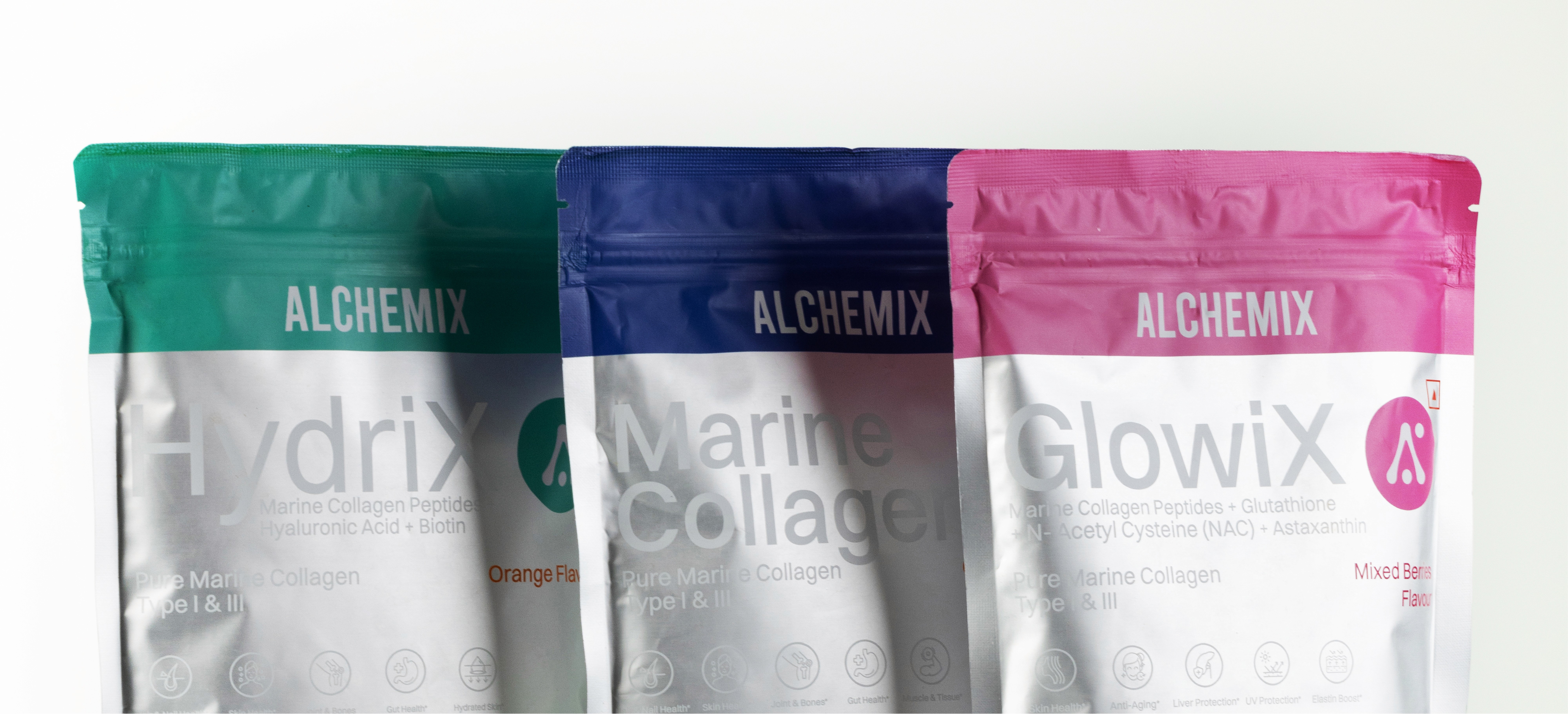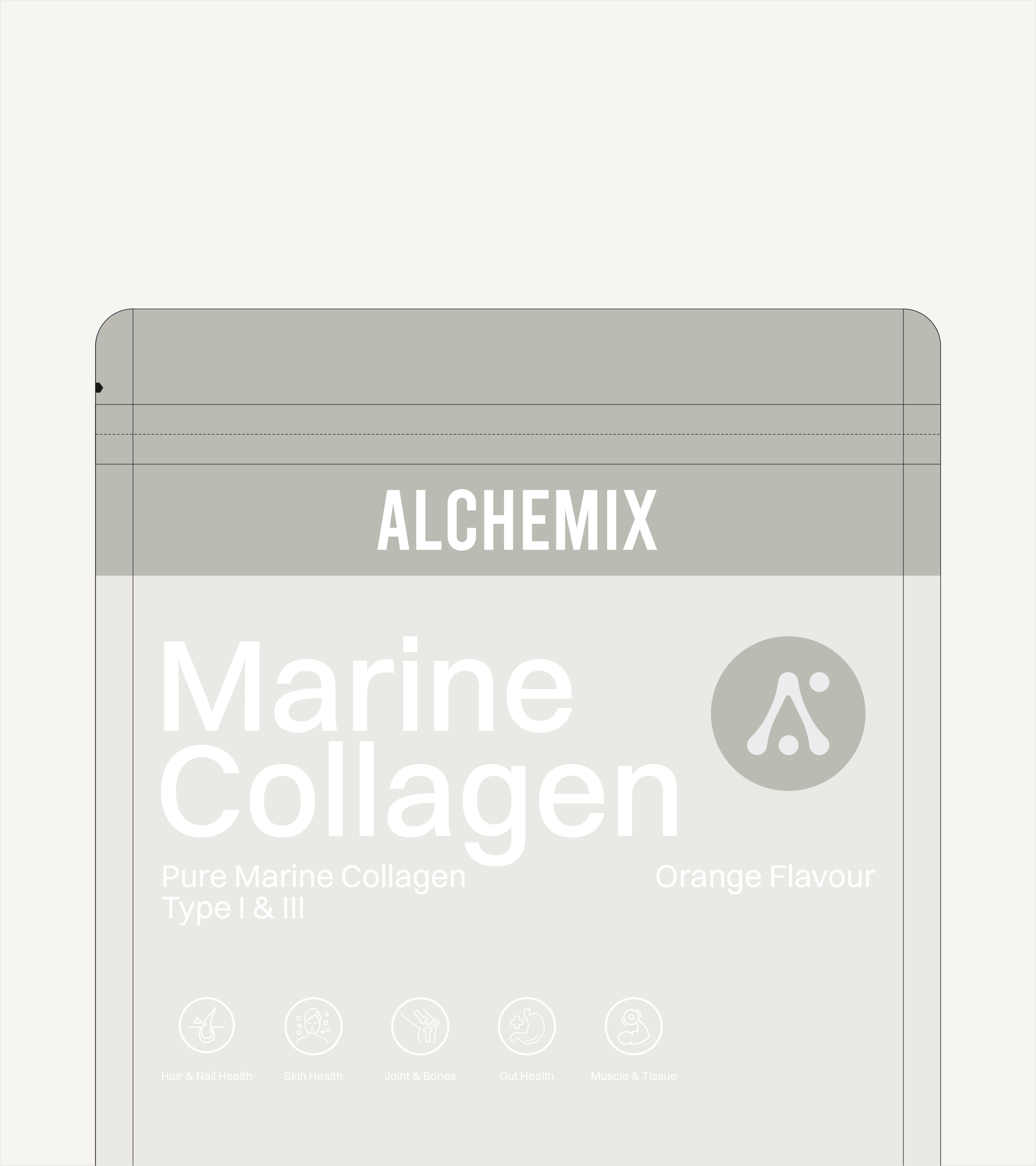 Silver foil. Not kraft, not linen, not anything that reaches for the organic. The surface catches light the way a laboratory does, clean and precise and unmistakably intentional. It signals before a word is read that what is inside was crafted at the molecular level, formulated to work from within, and designed to go beyond surface solutions. On a shelf full of botanical warmth and earthy textures, Alchemix is the clear, confident signal that stands apart. The packaging doesn't just contain the product. It makes the first argument for it.